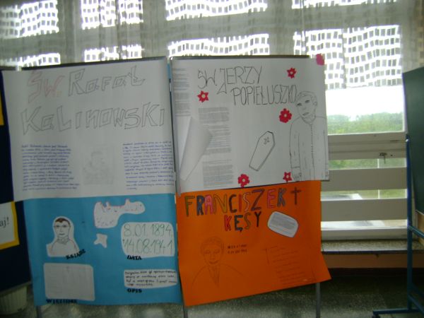 Uczniowie klas VI c i VId na lekcjach religii wykonali prace metodą projektu na temat: "Zło dobrem zwyciężaj". Tematyka prac dotyczyła wzorców osobowych. Postacie przedstawione na plakatach mogą służyć przykładem i być dla nas wzorem do naśladowania. Prace uczniów można było zobaczyć na wystawie w holu szkoły.