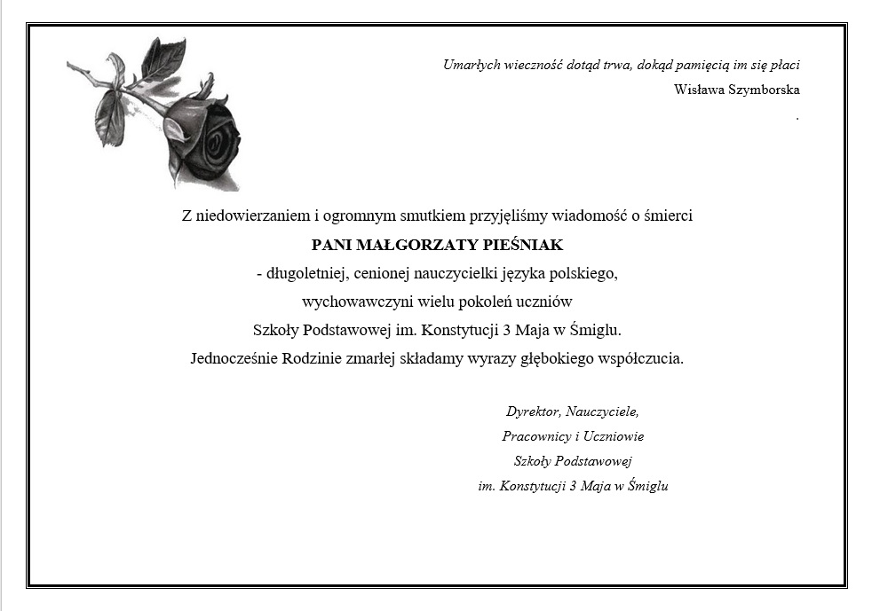 W sobotę 15 kwietnia odbyła się wyjątkowa uroczystość, upamiętniająca polskich oficerów zabitych 83 lat temu na rozkaz Stalina, a szczególnie syna Ziemi Śmigielskiej, Józefa Smelkowskiego – posterunkowego Policji Państwowej (zamordowanego w 1940 r. w Twerze). Najpierw zaproszeni goście (w tym członkowie rodziny Józefa Smelkowskiego), dyrekcja, nauczyciele i uczniowie zebrali się w auli szkolnej, gdzie obejrzeli montaż słowno-muzyczny w wykonaniu młodzieży. Był on poświęcony historii zbrodni z 1940 roku. Następnie uczestnicy uroczystości udali się przed budynek szkoły. Po wprowadzeniu sztandarów i odśpiewaniu hymnu Burmistrz Śmigla – Małgorzata Adamczak i wnuk zamordowanego odsłonili pamiątkową tablicę. Potem zasadzono drugi w historii szkoły Dąb Pamięci. Drzewo posadzili wspólnie: przewodniczący Rady Miejskiej – Wiesław Kasperski; pierwszy zastępca komendanta powiatowego policji – Tomasz Garstecki, dyrektor szkoły – Robert Plewka, przedstawiciel uczniów – Jędrzej Nowak oraz wnuczki i wnukowie Józefa Smelkowskiego. Następnie ks. kanonik Krzysztof Mizerski dokonał poświęcenia sadzonki oraz tablicy pamiątkowej. Na zakończenie przedstawiciele uczniów złożyli pod tablicami poświęconymi Józefowi Smelkowskiemu i Tadeuszowi Daszkiewiczowi kwiaty oraz zapalili znicze. (MW)
