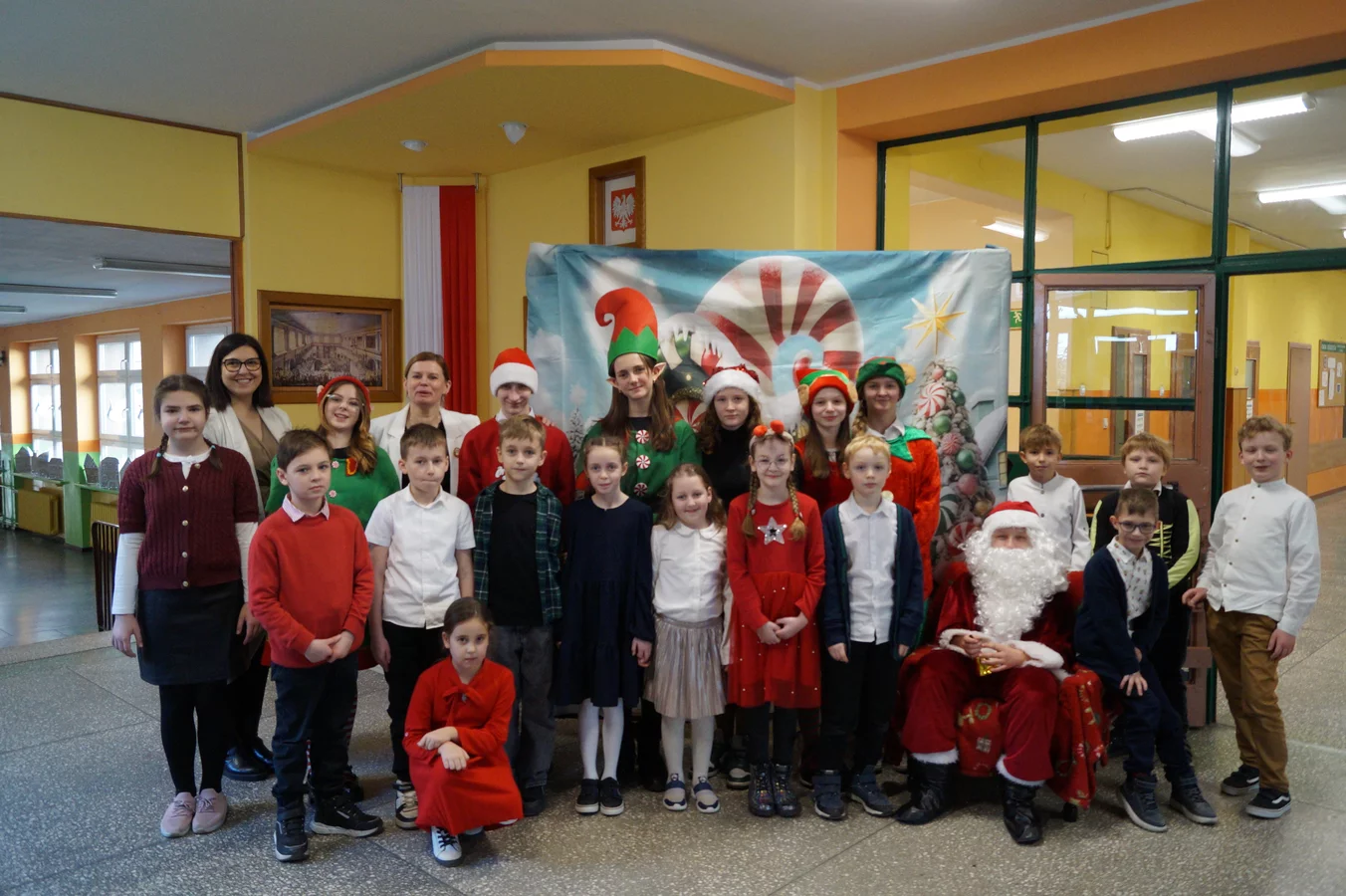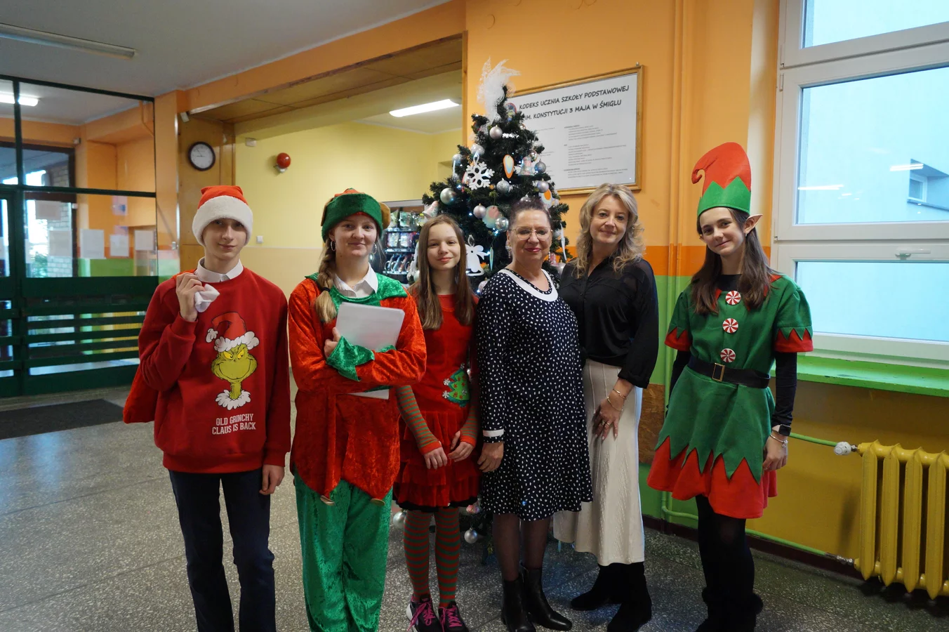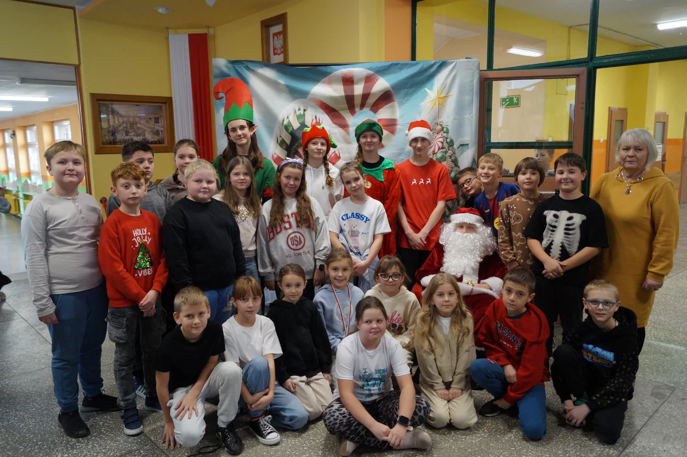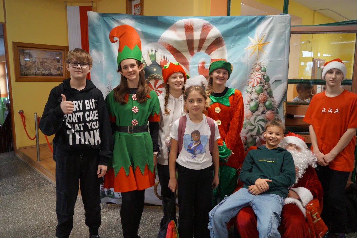 Z kolędami w tle, jeszcze przed wejściem do szkoły, witali nas przedstawiciele SU - świąteczne elfy oraz sam Mikołaj. Każdy, kto przekraczał próg szkoły, mógł poczuć wyjątkowy klimat i uśmiechnąć się na myśl o miłej niespodziance.