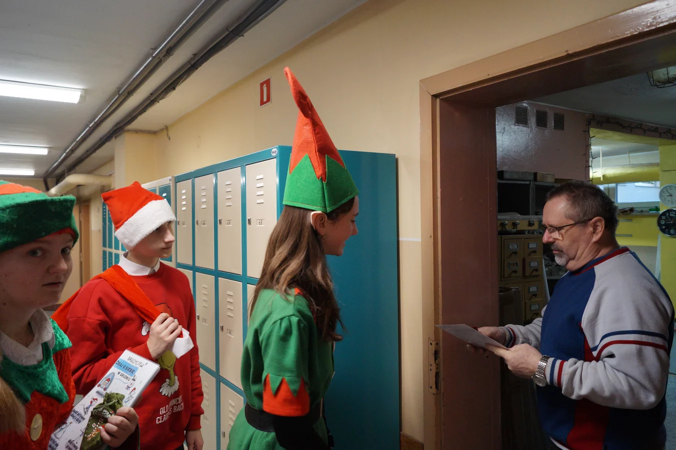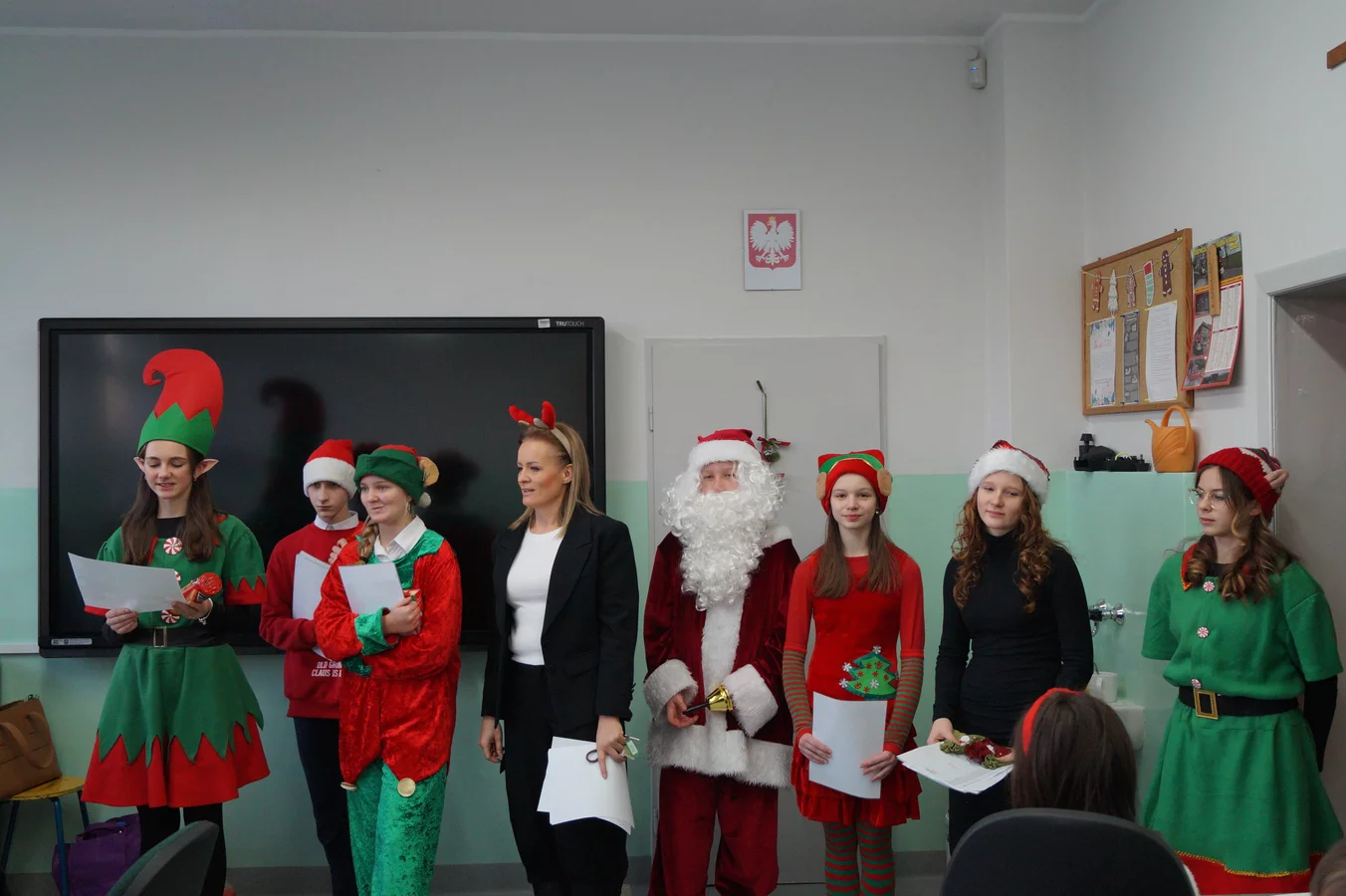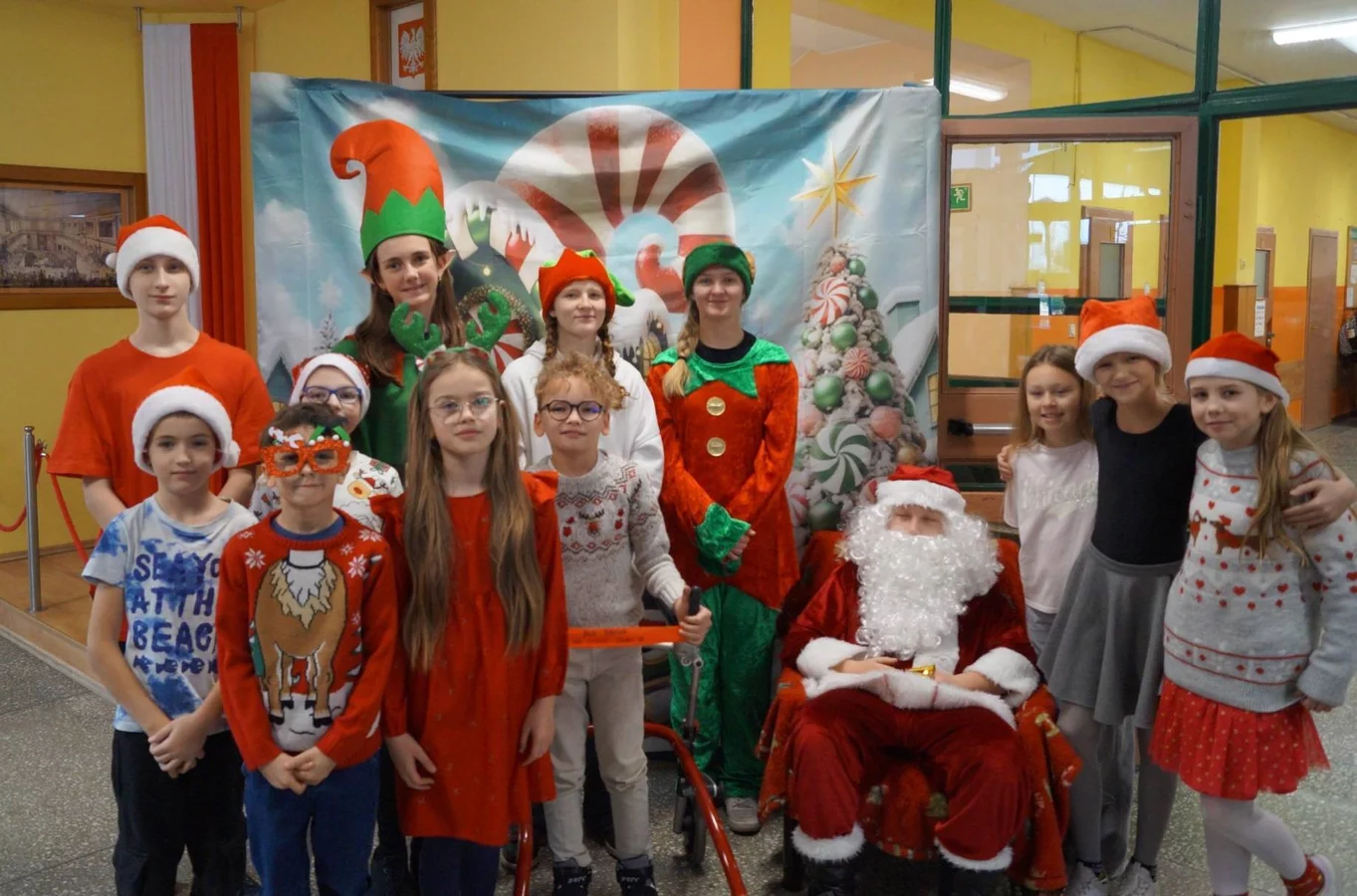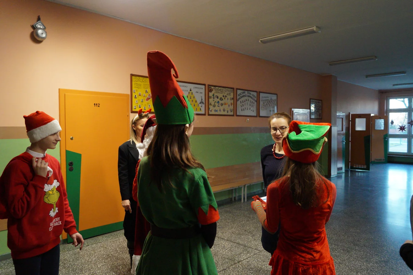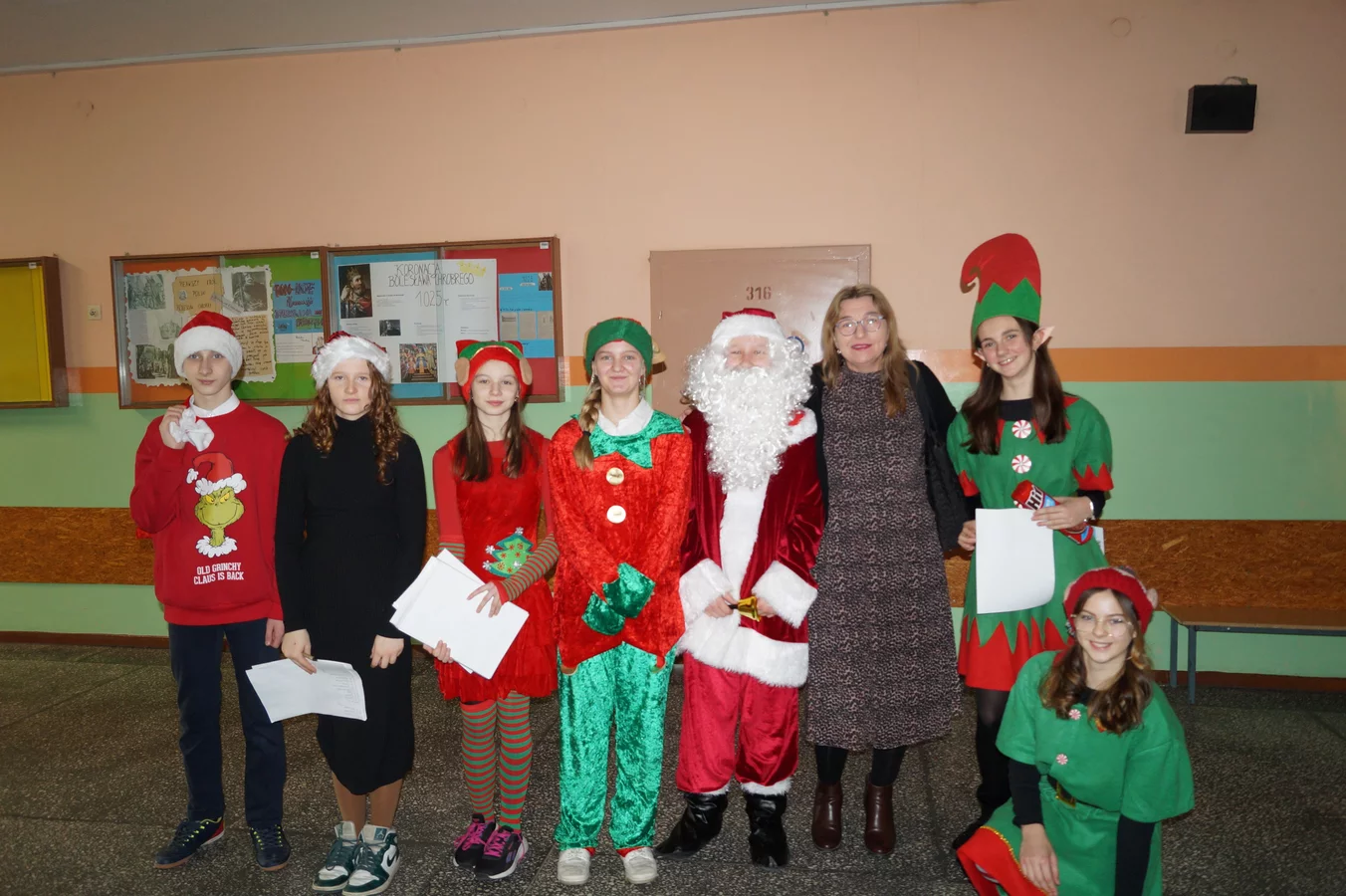 Z kolędami w tle, jeszcze przed wejściem do szkoły, witali nas przedstawiciele SU - świąteczne elfy oraz sam Mikołaj. Każdy, kto przekraczał próg szkoły, mógł poczuć wyjątkowy klimat i uśmiechnąć się na myśl o miłej niespodziance.