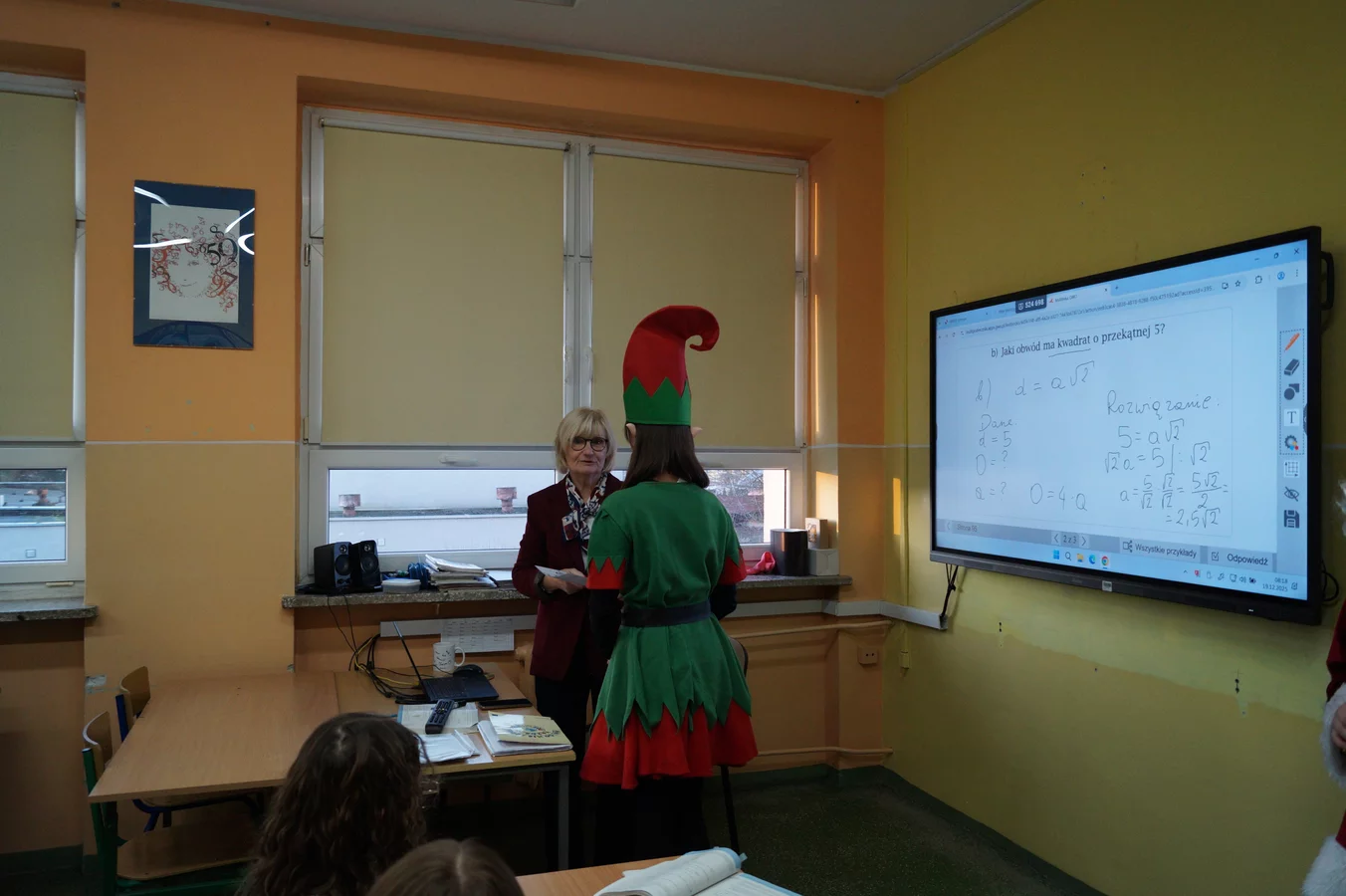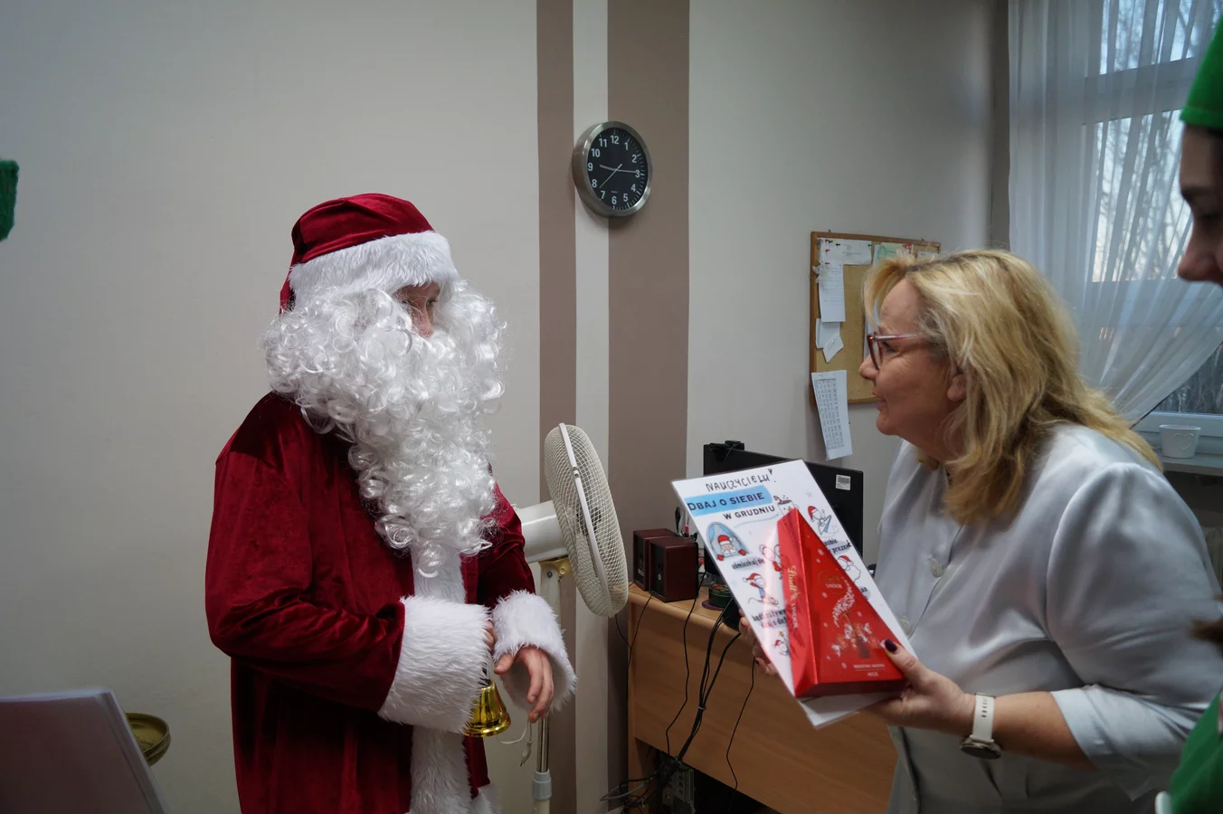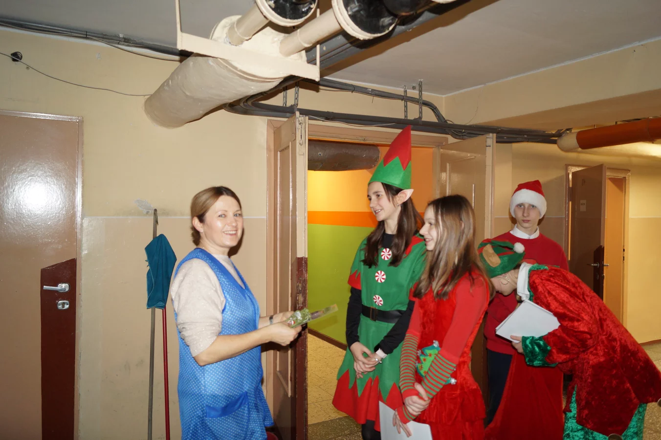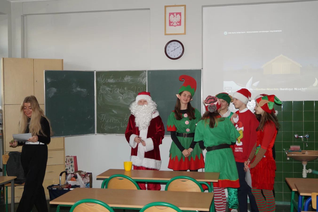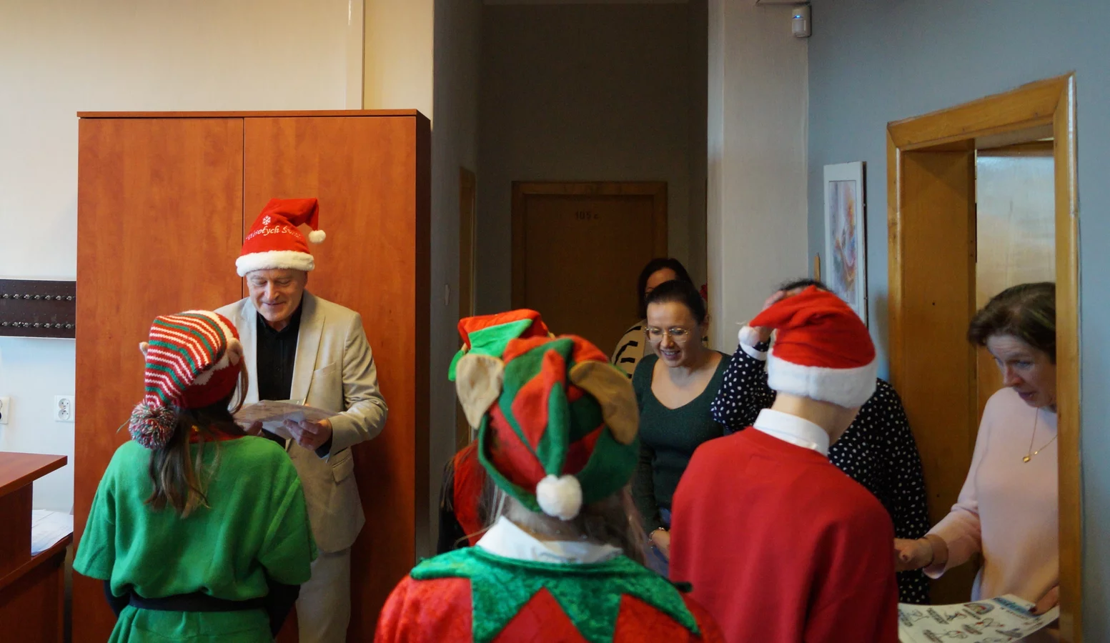 Z kolędami w tle, jeszcze przed wejściem do szkoły, witali nas przedstawiciele SU - świąteczne elfy oraz sam Mikołaj. Każdy, kto przekraczał próg szkoły, mógł poczuć wyjątkowy klimat i uśmiechnąć się na myśl o miłej niespodziance.